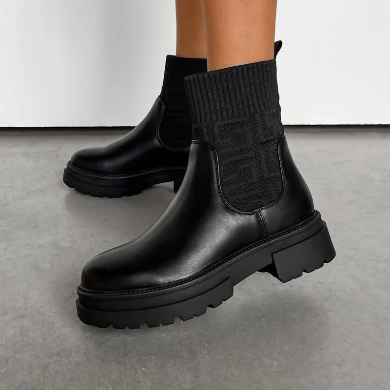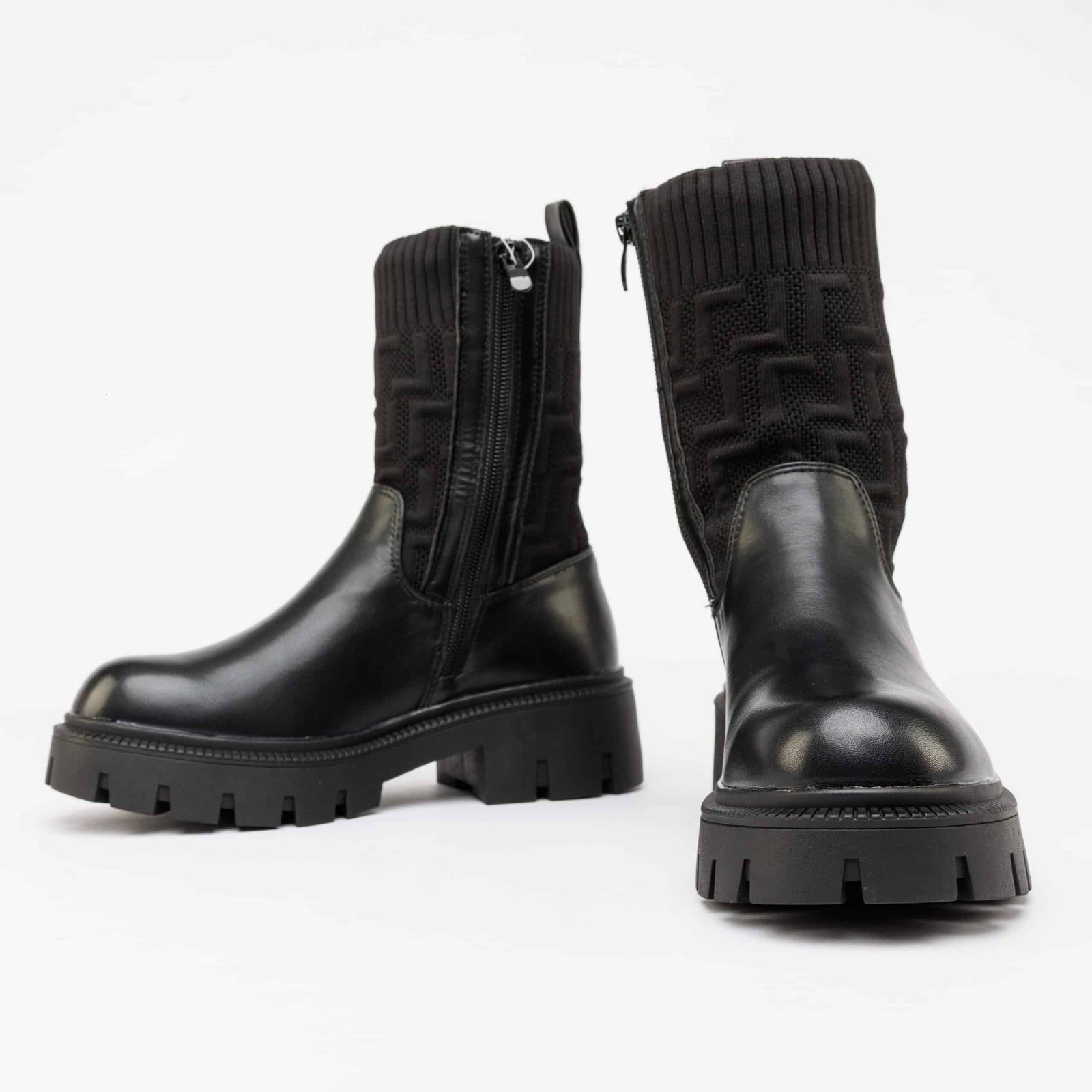 يتميز الحذاء بتصميم يجمع بين الجلد الناعم في الأسفل وخامة منسوجة مرنة في الجزء العلوي، مما يمنحه مظهرًا فريدًا يلفت الأنظار دون مبالغة. الجزء السفلي يأتي بجلد أسود عالي الجودة، مقاوم للمطر والرطوبة، وسهل التنظيف، بينما تم تصميم الجزء العلوي بخامة منسوجة ناعمة تمنح القدم الدفء وتساعد على التمدد لتناسب مختلف قياسات الساق.