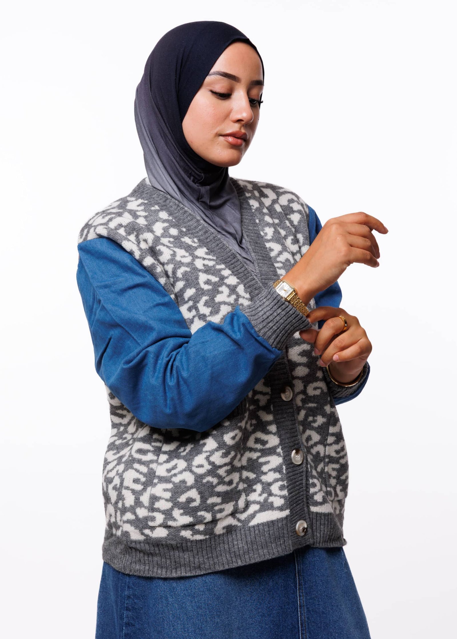 النسيج الصوفي المستخدم يتميز بملمس ناعم يمنح شعورًا بالدفء المريح دون أن يسبب ثقلًا أو حكة على البشرة، بينما تضيف خامة الجينز لمسة من التماسك والحيوية. هذه السترة ليست مجرد قطعة ملابس، بل قطعة عصرية تعبّر عن شخصية قوية وواثقة تحب أن تبرز بأسلوبها الفريد.