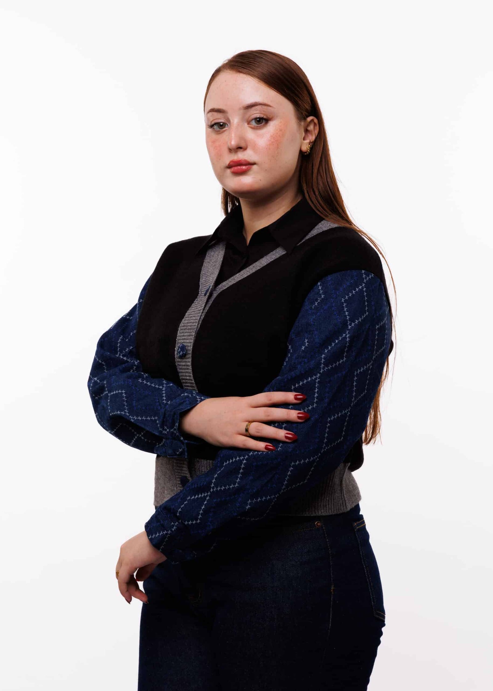 تم تصميم هذه السترة بعناية فائقة لتجمع بين النعومة الفاخرة للصوف والقوة العصرية لقماش الجينز. يأتي الجزء الأساسي مصنوعًا من صوف ناعم الملمس، يمنح إحساسًا فوريًا بالدفء والراحة، بينما تضيف الأكمام المصنوعة من الجينز لمسة مميزة من التوازن والجاذبية البصرية. هذا التداخل بين الخامات يعكس روح المرأة العصرية التي تجمع بين الرقة والقوة في آنٍ واحد.