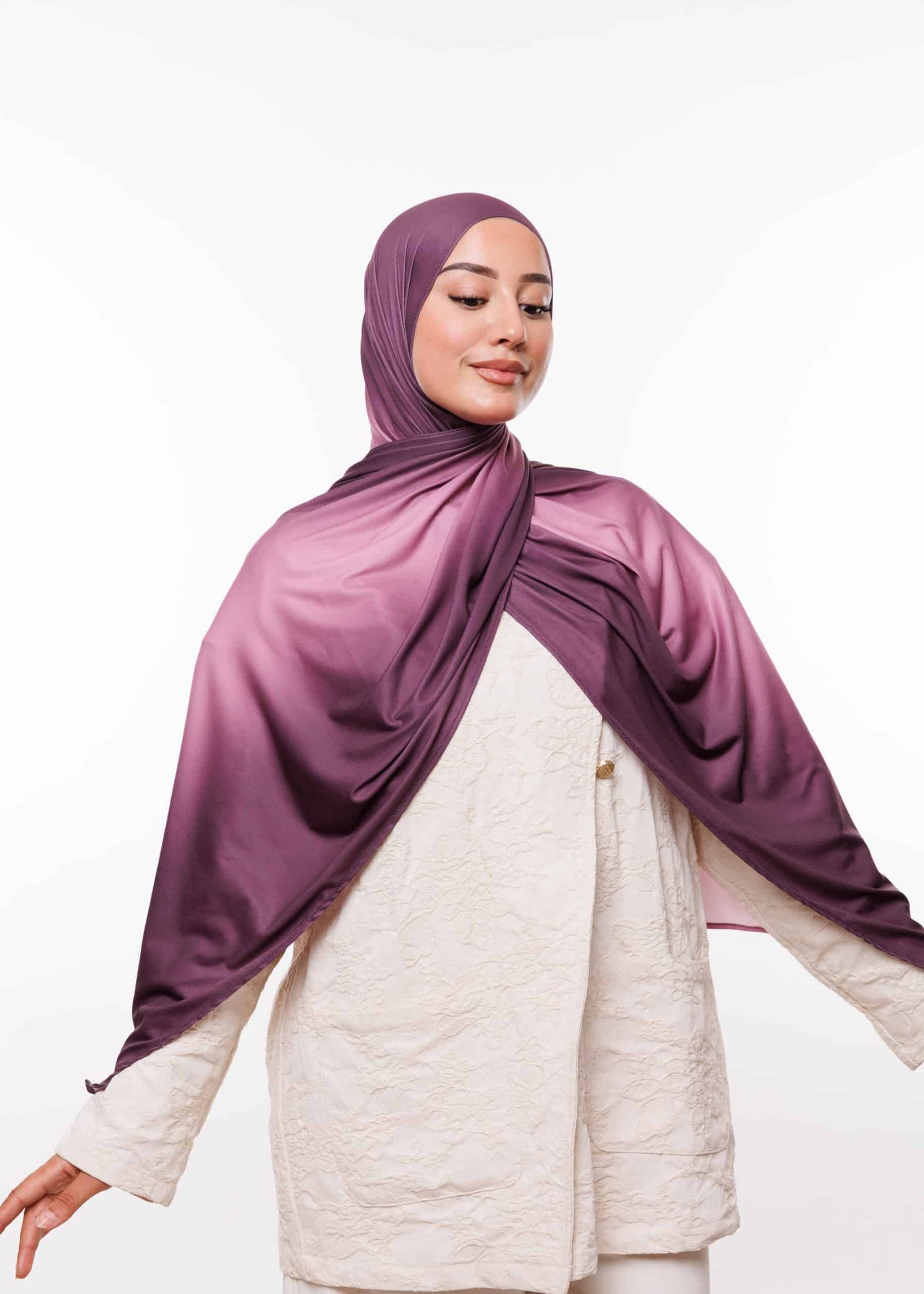 يمكنك ارتداء هذا الشال مع العبايات الخليجية، الفساتين الكاجوال، أو حتى الملابس الرسمية لإضفاء لمسة أنيقة. الألوان المتدرجة تمنحك مرونة أكبر في التنسيق مع مختلف قطع الملابس، مما يجعلها خيارك الأمثل للظهور دائماً بأناقة متجددة.
