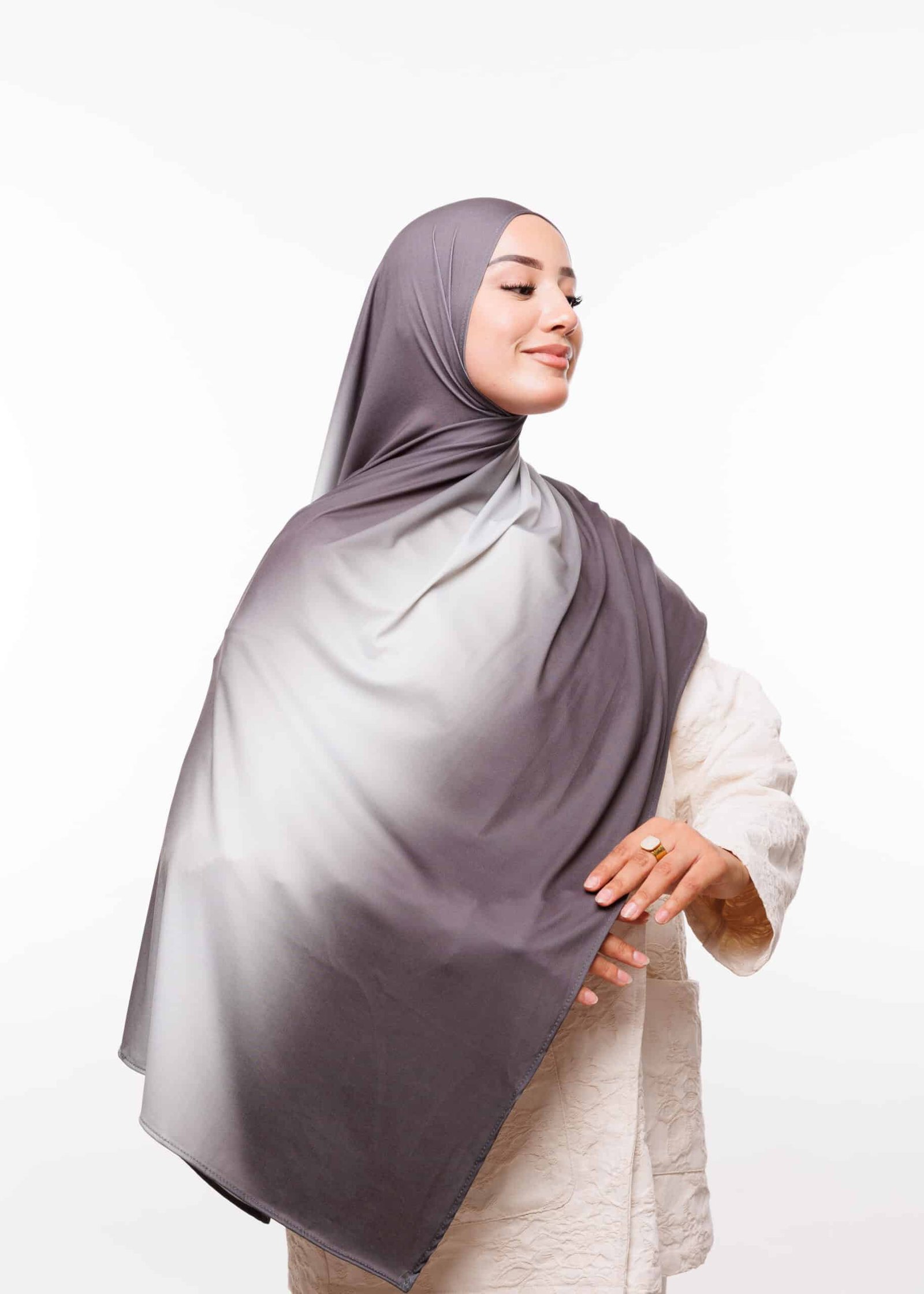 يمكنك ارتداء هذا الشال مع العبايات الخليجية، الفساتين الكاجوال، أو حتى الملابس الرسمية لإضفاء لمسة أنيقة. الألوان المتدرجة تمنحك مرونة أكبر في التنسيق مع مختلف قطع الملابس، مما يجعلها خيارك الأمثل للظهور دائماً بأناقة متجددة.