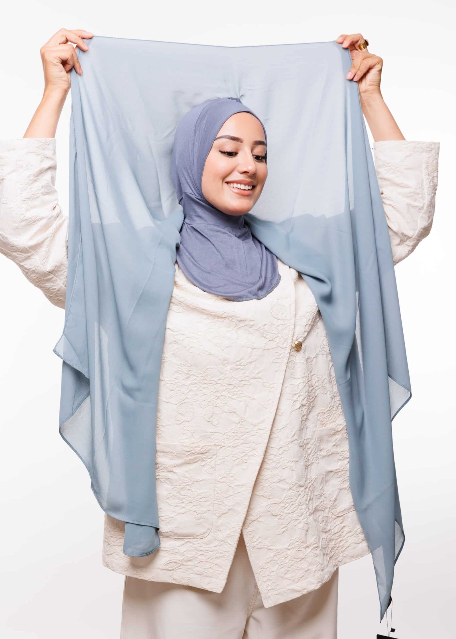 صُنع الثوب من قماش كريب عالي الجودة يتمتع بمواصفات مميزة من حيث المتانة والنعومة والانسيابية. كما أن القُبعة الداخلية مصنوعة من قماش Lycra المعروف بمرونته وتماسكه الجيد على الرأس، مما يجعله مريحًا أثناء الارتداء لفترات طويلة، دون التسبب في انزعاج أو ضغط. القماش الداخلي يساعد أيضًا في تثبيت الحجاب أو الغطاء دون الحاجة إلى دبابيس أو ملحقات إضافية، مما يجعل عملية اللبس سهلة وسريعة.